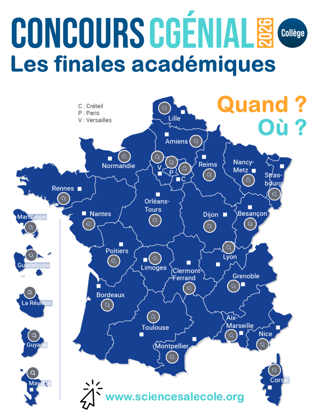 Pour connaître les dates et lieux des finales académiques du Concours CGénial-Collège 2026, cliquez sur la carte ci-dessous pour ouvrir la page interactive, puis cliquez sur la loupe correspondant à votre académie.