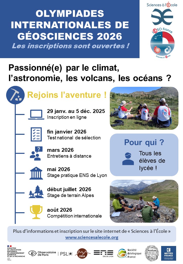 Les inscriptions pour les 19èmes Olympiades internationales de Géosciences (IESO) sont ouvertes Les inscriptions au test national de sélection pour les IESO sont ouvertes jusqu’au vendredi 5 décembre 2025. Formulaire d'inscription Pour présenter des élèves au test national de sélection pour les IESO 2026, les enseignants doivent les inscrire en remplissant...