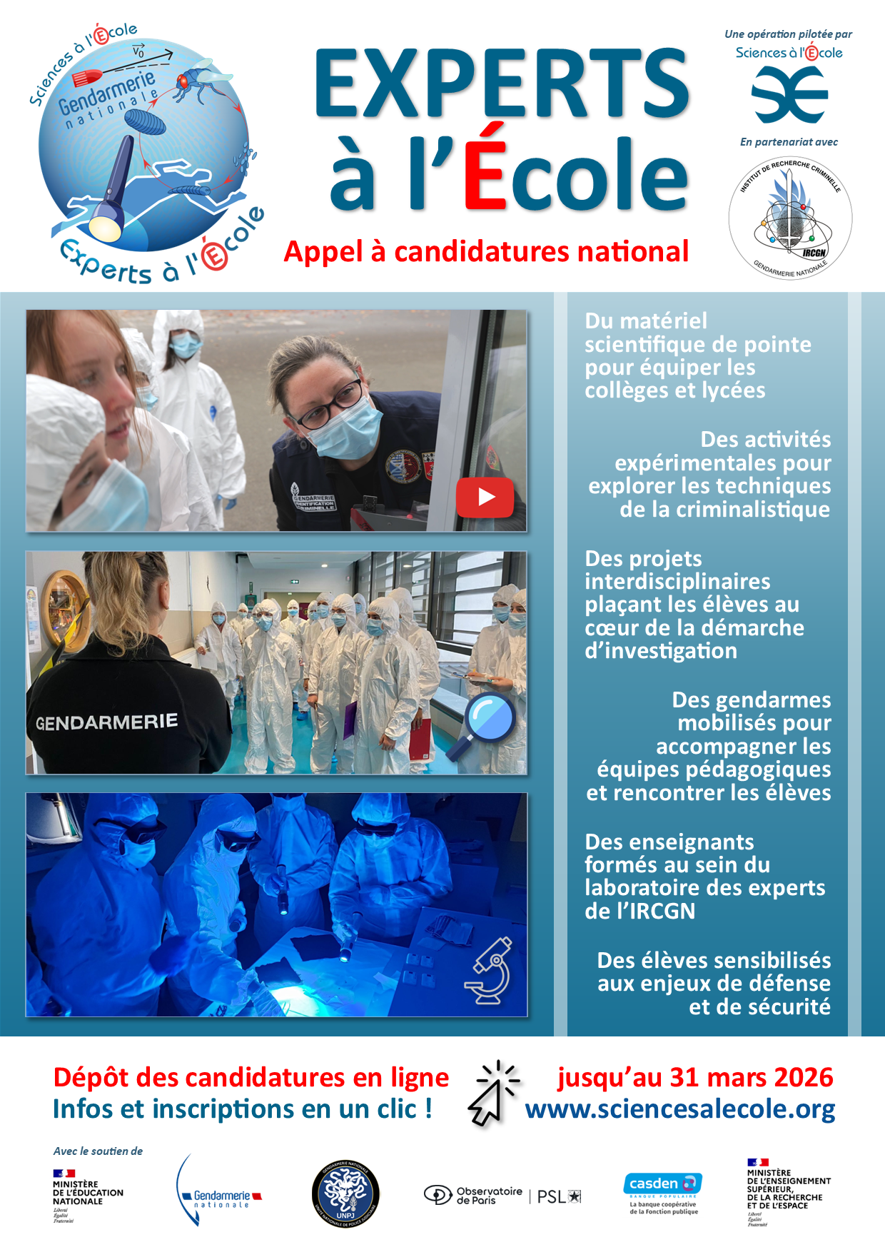 Le dispositif ministériel « Sciences à l’École » lance cette année un nouvel appel à candidatures national dans le cadre de l’opération « EXPERTS à l’École », le plus ample et ambitieux depuis ceux de 2015 et 2016 lors du lancement de l’opération. À la clé, du matériel scientifique de pointe mis à disposition des établissements scolaires, et une formation scientifique pour les enseignants au sein du laboratoire de l’Institut de Recherche Criminelle de la Gendarmerie Nationale (IRCGN), partenaire de l’opération.