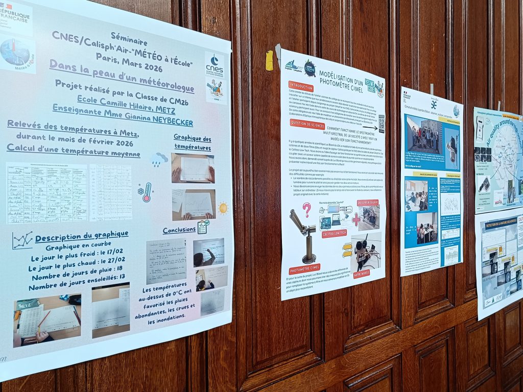Les participants ont produit un poster présentant une activité menée en classe, un projet sur l’année, ou toute autre utilisation du matériel scientifique qui leur est prêté dans le cadre de « MÉTÉO à l’École » ou de Calisph’Air. Les posters ont été exposés pendant toute la durée du séminaire dans la salle de conférence à la Cité de l’espace. Des sessions posters ont été organisées, pendant lesquelles les enseignants et intervenants ont échangé à propos des pratiques pédagogiques mises en place autour de la météorologie, de la climatologie et de l’étude de l’atmosphère.