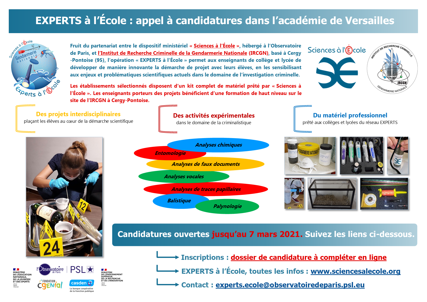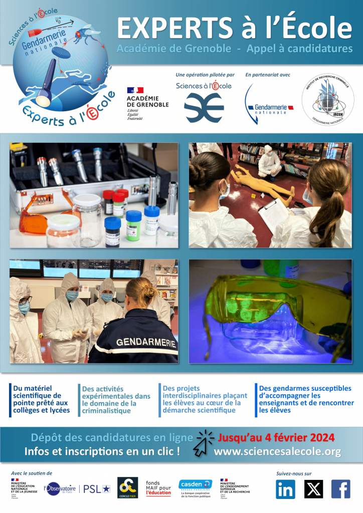 Les établissements scolaires sélectionnés bénéficieront du prêt de la mallette pédagogique. Un stage de formation pour les enseignants porteurs de projets sera organisé à l’automne 2026 et leur permettra de rencontrer les experts de la gendarmerie scientifique à Pontoise au sein du laboratoire de l’Institut de Recherche Criminelle de la Gendarmerie Nationale (IRCGN), partenaire de l’opération.