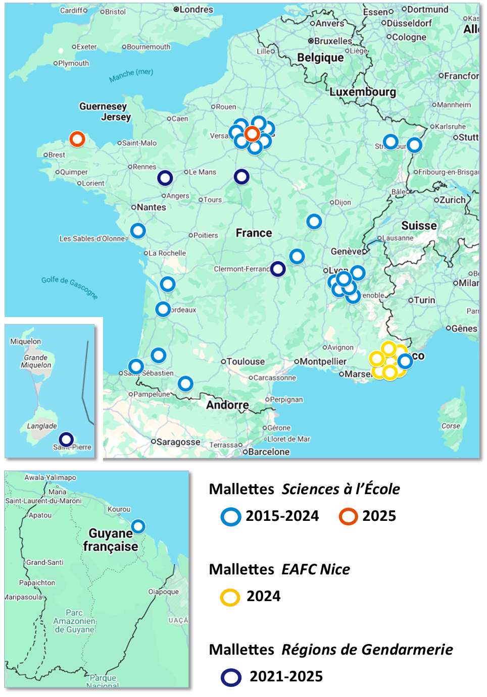 Ces mallettes financées et déployées directement par « Sciences à l’École » depuis 2015 sont prêtées aux établissements pour une durée de trois ans, renouvelable. 27 d’entre elles sont actuellement mises à disposition de collèges et lycées sur l’ensemble du territoire national.