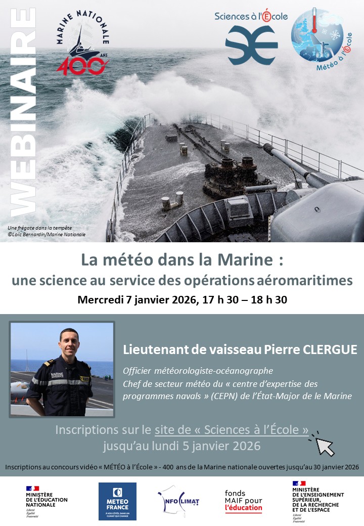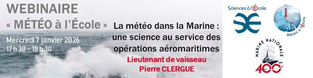 Le mercredi 7 janvier 2026, de 17 h 30 à 18 h 30, « Sciences à l’École » vous invite a un webinaire organisé dans le cadre de l’opération « MÉTÉO à l’École » et des 400 ans de la Marine nationale. Ce webinaire est ouvert aux enseignants du second degré, qu’ils soient membres ou non du réseau « MÉTÉO à l’École », aux étudiants, et à toutes personnes intéressés par la météorologie et la climatologie.